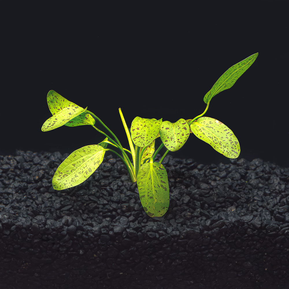 The Ozelot Green Sword is a striking and hardy aquatic plant, renowned for its vibrant green leaves adorned with unique dark spots, resembling the patterns of an ocelot. Its bold appearance and robust growth make it a standout choice for aquarists seeking a low-maintenance plant that adds character and depth to their aquascape.